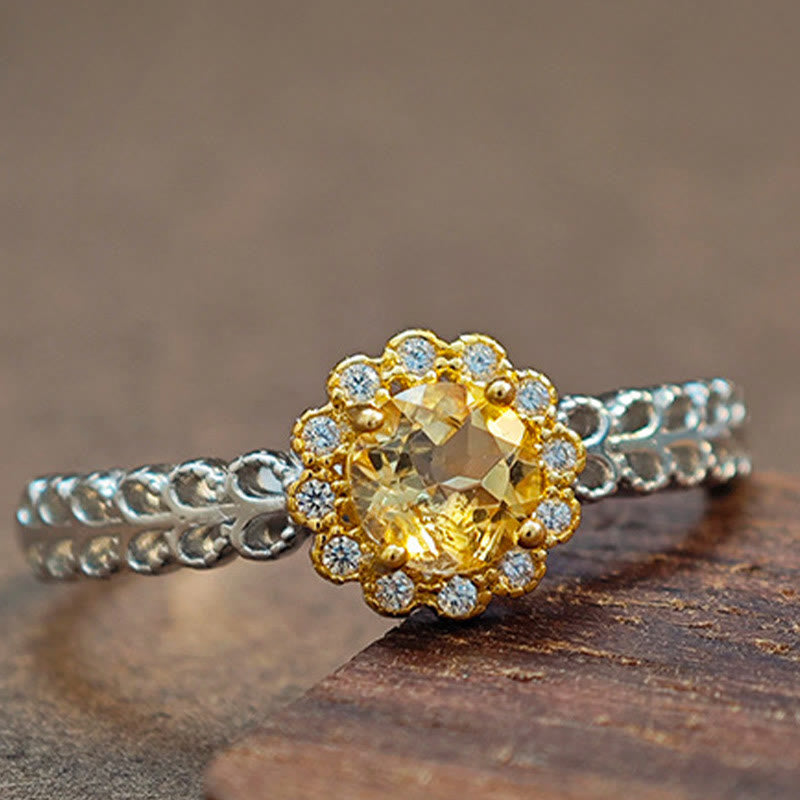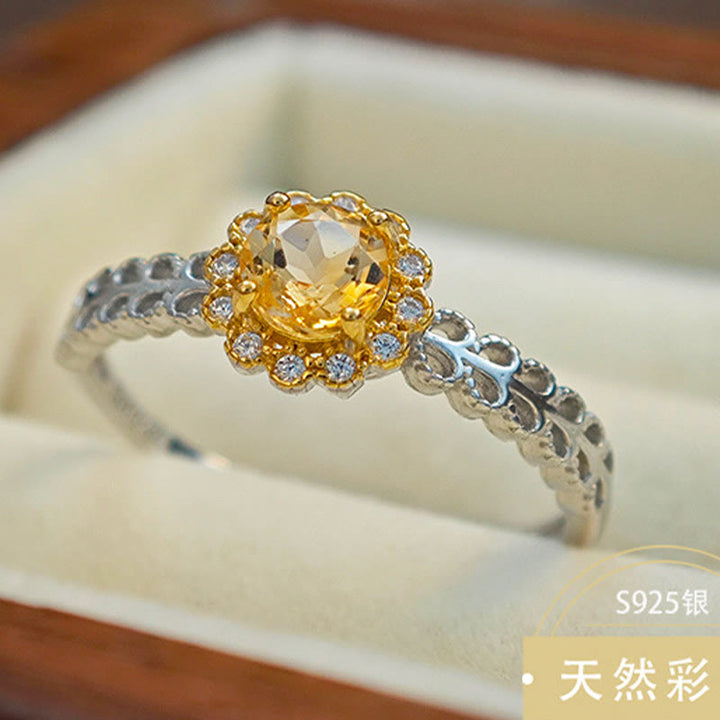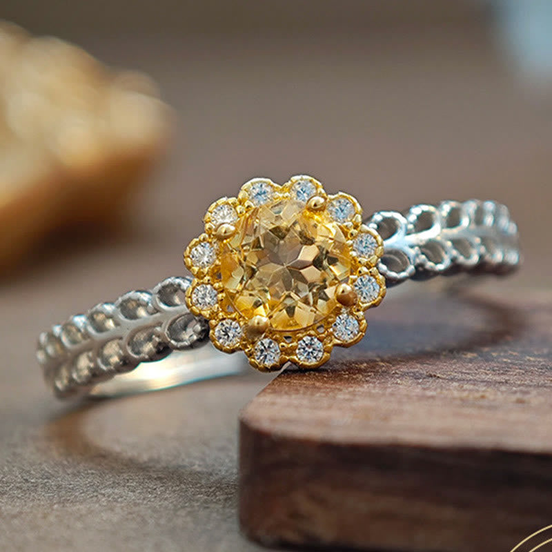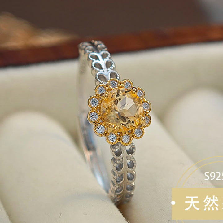 La bague en citrine naturelle présente un magnifique motif de tournesol avec une pierre précieuse en citrine rayonnante en son centre. Le tournesol incarne la vitalité et la joie, tandis que la citrine est connue pour favoriser l'abondance et l'énergie positive. Conçue avec soin, cette bague capture l'essence de la lumière du soleil et de la résilience, servant de rappel significatif de l'optimisme et de la croissance. C'est un signe parfait de prospérité et d'énergie exaltante.