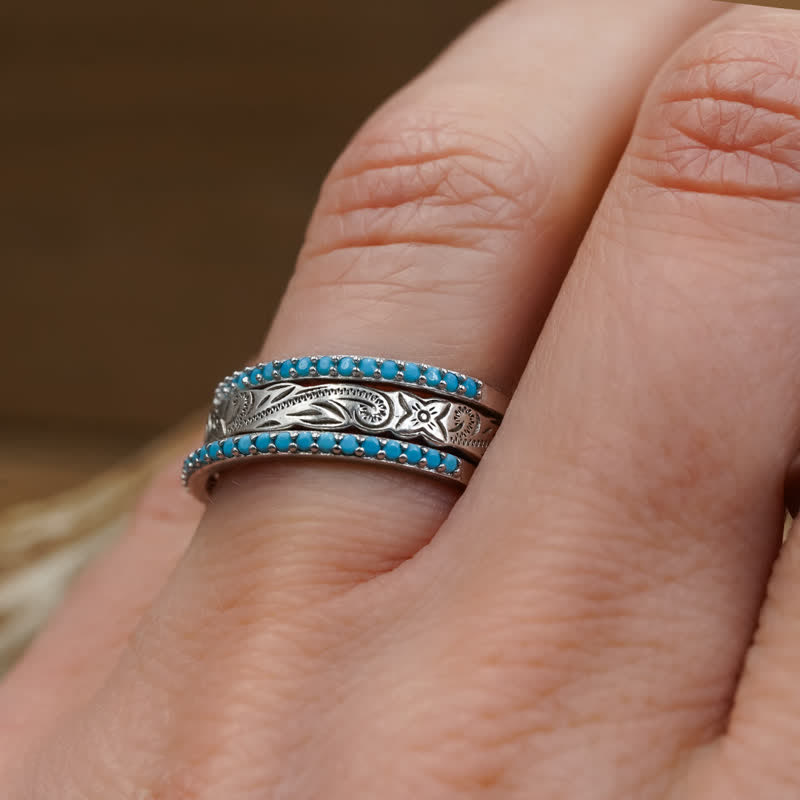La bague triple en argent gravée de turquoise présente une bande centrale gravée de motifs floraux détaillés, flanquée de bandes turquoise. La combinaison de l'argent gravé et de la turquoise offre un mélange harmonieux d'art naturel et de signification spirituelle. Cette bague sert d'accessoire de mise à la terre, symbolisant la paix et l'équilibre.