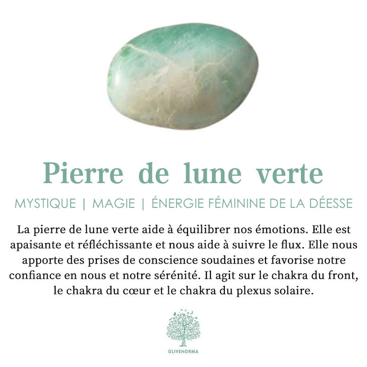 La pierre de lune verte aide à équilibrer nos émotions. Elle est apaisante et réfléchie et nous aide à « suivre le courant ». Elle nous apporte des éclairs de perspicacité et stimule notre confiance en soi et notre sang-froid. Il agit sur le chakra du troisième œil, le chakra du cœur et le chakra du plexus solaire.