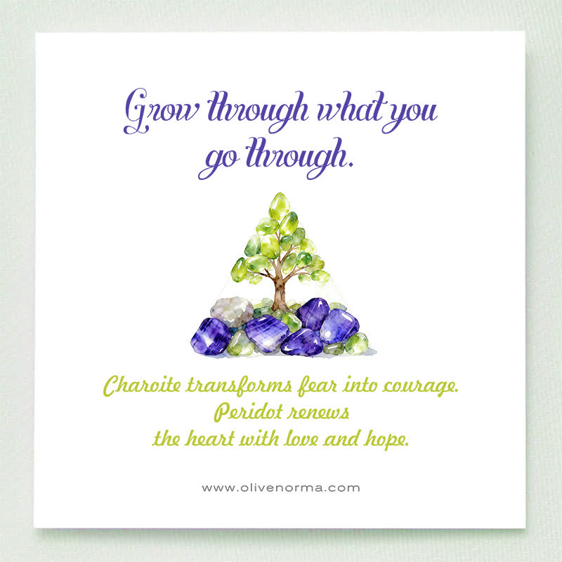 La Charoïte transforme la peur en courage, tandis que le Péridot renouvelle le cœur avec amour et espoir.