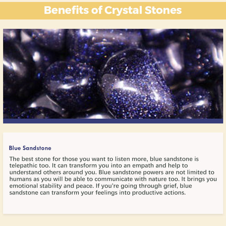 La meilleure pierre pour ceux qui veulent écouter davantage, le grès bleu est également télépathique. Il peut vous transformer en empathique et vous aider à comprendre les autres autour de vous. Les pouvoirs du grès bleu ne se limitent pas aux humains, car vous pourrez également communiquer avec la nature. Il vous apporte stabilité émotionnelle et paix. Si vous traversez un deuil, le grès bleu peut transformer vos sentiments en actions productives.