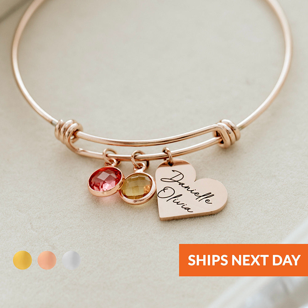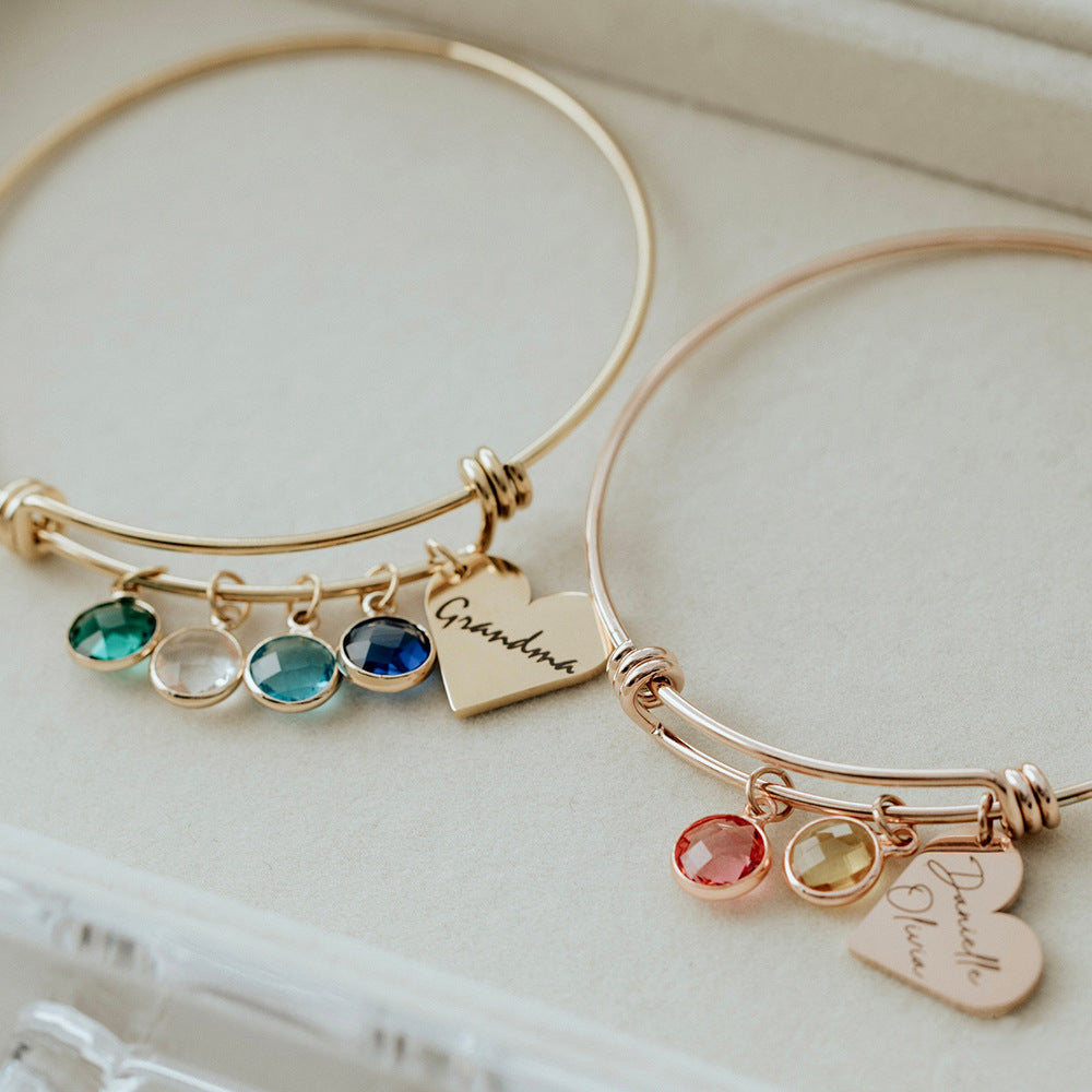Ce bracelet avec pierre de naissance est doté d'un design rétractable pour un ajustement parfait, orné d'une breloque en forme de cœur sur laquelle peuvent être gravés des noms ou des messages spéciaux. Associé à une pierre de naissance personnalisable, il devient une pièce profondément personnelle, reflétant l'histoire et les moments précieux de la personne qui le porte.