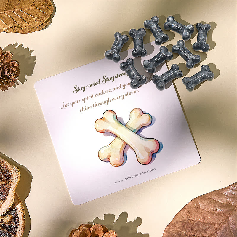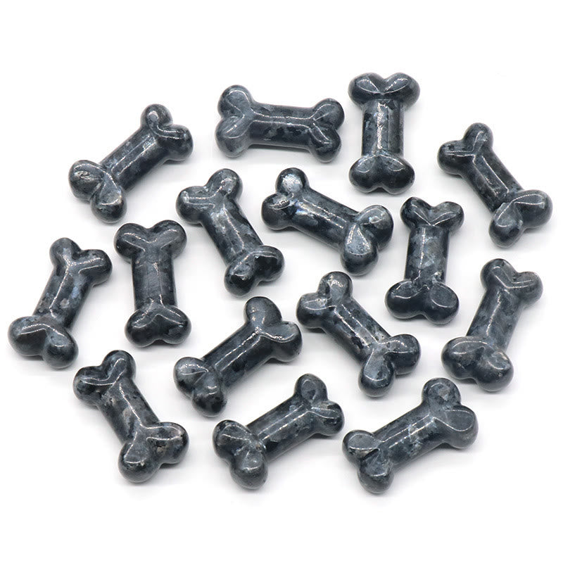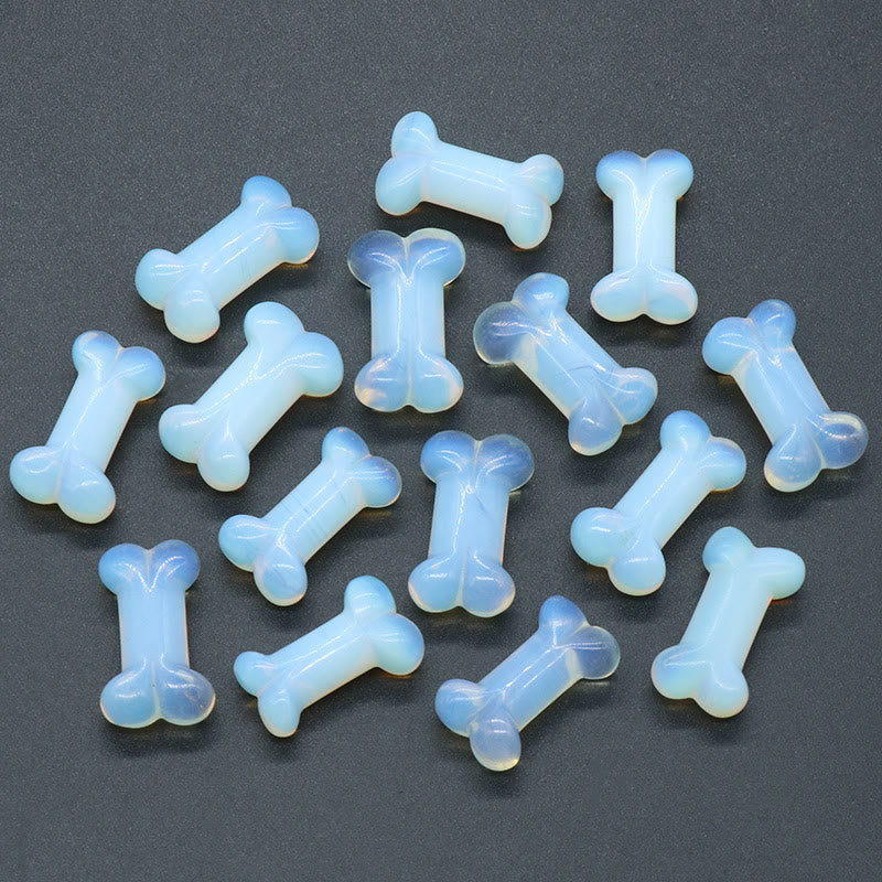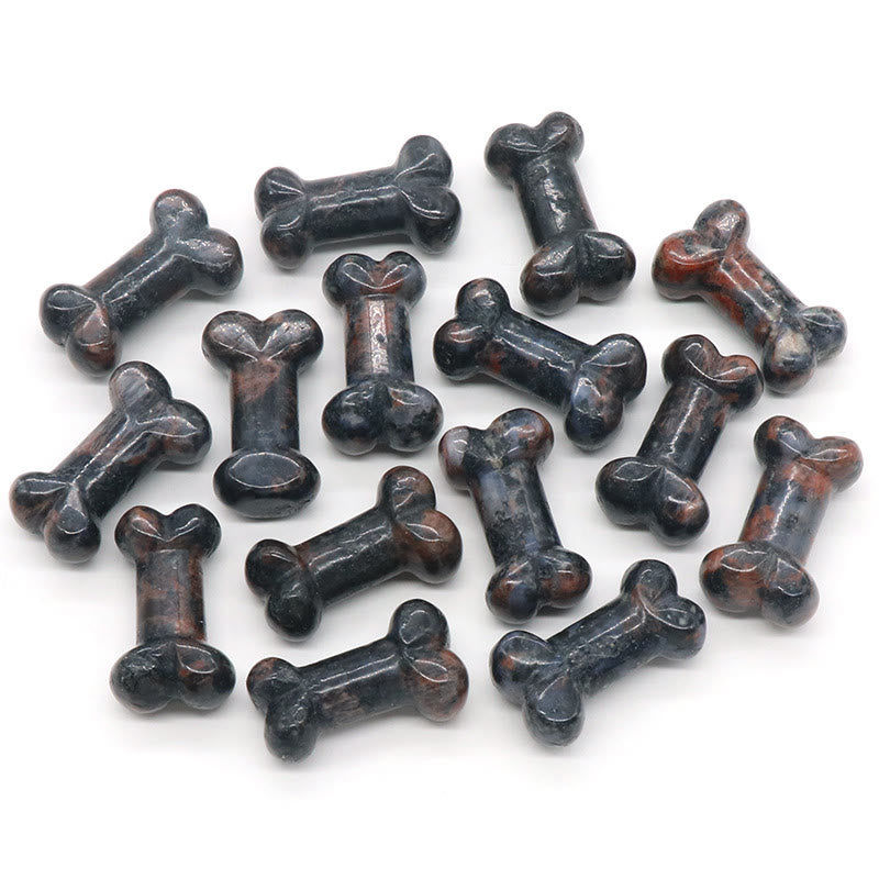- Chaque mini-os est sculpté dans différentes pierres précieuses comme le jaspe dalmatien, la lépidolite et le jaspe rouge, chacune possédant ses propres vertus curatives. Le jaspe dalmatien favorise la joie et l'insouciance, tandis que le jaspe rouge ancre l'esprit et lui confère courage et stabilité.