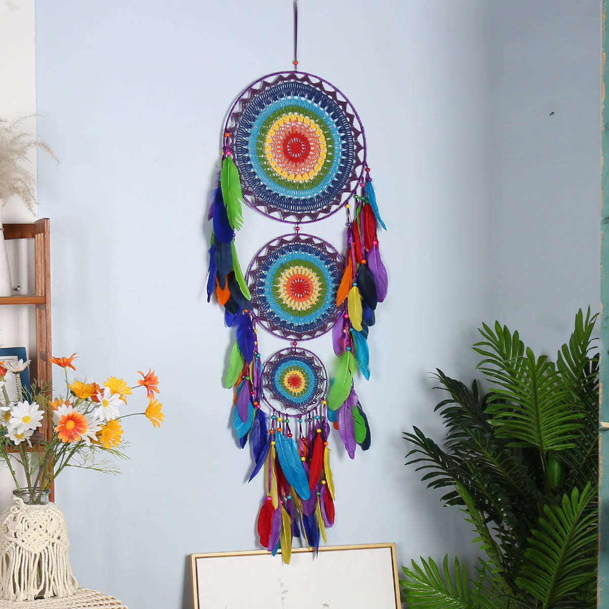 L'attrape-rêves tissé à motifs multiples de style bohème est une pièce artisanale qui tisse des motifs complexes, apportant une énergie vibrante et des vibrations positives dans n'importe quelle pièce. Chaque motif reflétant des symboles bohèmes uniques, cet attrape-rêves favorise l'harmonie et un sommeil paisible. Les plumes colorées pendent gracieusement en dessous, représentant la protection et la clarté spirituelle, ce qui le rend idéal pour la méditation et les espaces de pleine conscience.