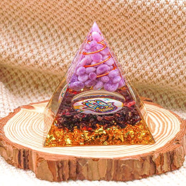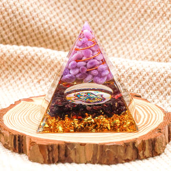 - Nom : Pyramide d'orgone de guérison Hamsa en jade violet Olivenorma avec grenat